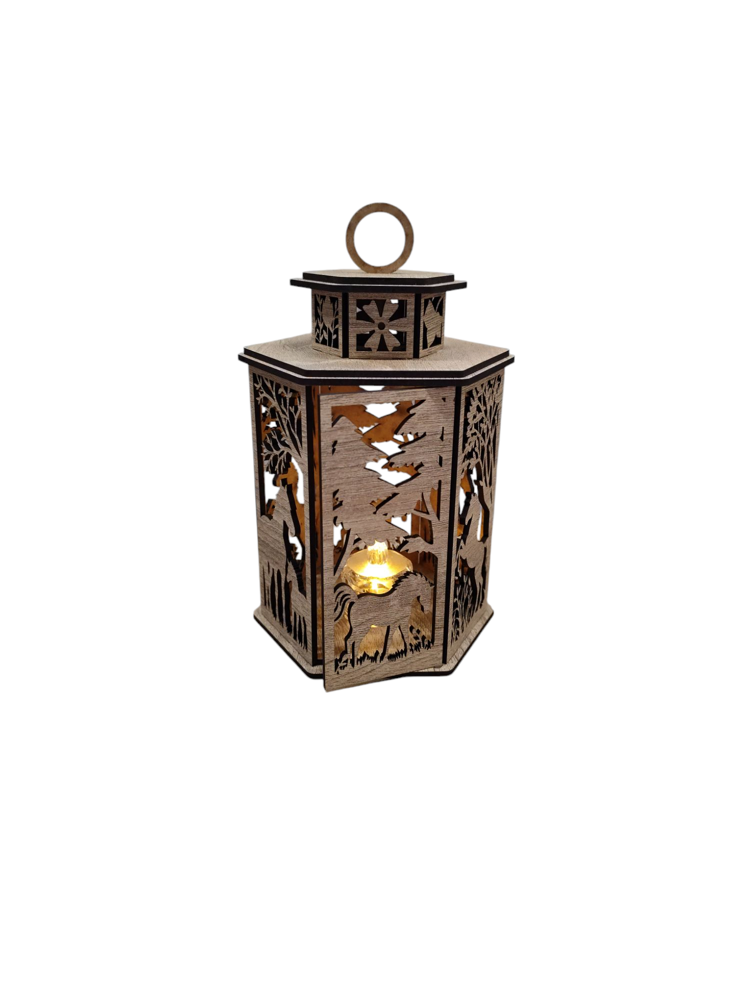 Táto drevená lucerna je dokonalým spojením prírodného materiálu a majestátnej krásy koní. Je vyrobená z kvalitného dreva a ponúka veľké množstvo dekorov dreva, vďaka čomu si môžete vybrať dizajn, ktorý dokonale ladí s vaším interiérom.