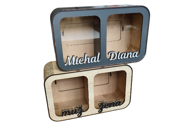 Táto drevená pokladnička je nielen praktickým úložným priestorom, ale aj jedinečnou dekoráciou do vášho domova. Vyrobená pre manželov, súrodencov, spolubývajúcich ktorí si môžu šetriť spolu ale zároveň každý zvlášť. Je vyrobená z kvalitného dreva, ponúka možnosť personalizácie – môžete si vybrať mená, ktoré bude zdobiť jej povrch. Vďaka precíznemu spracovaniu a elegantnému dizajnu sa skvele hodí do každej domácnosti.