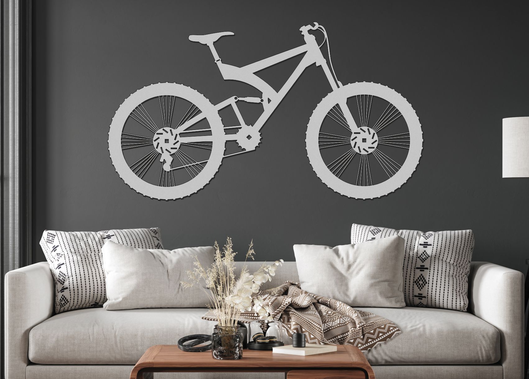 Minimalistická silueta horského bicykla vytvára silný vizuálny kontrast a okamžite pritiahne pohľad. Práve v jednoduchosti je jeho sila - hodí sa do moderných, industriálnych aj športovo ladených interiérov. Perfektne vynikne nad sedačkou, pracovným stolom alebo v priestore venovanom hobby.