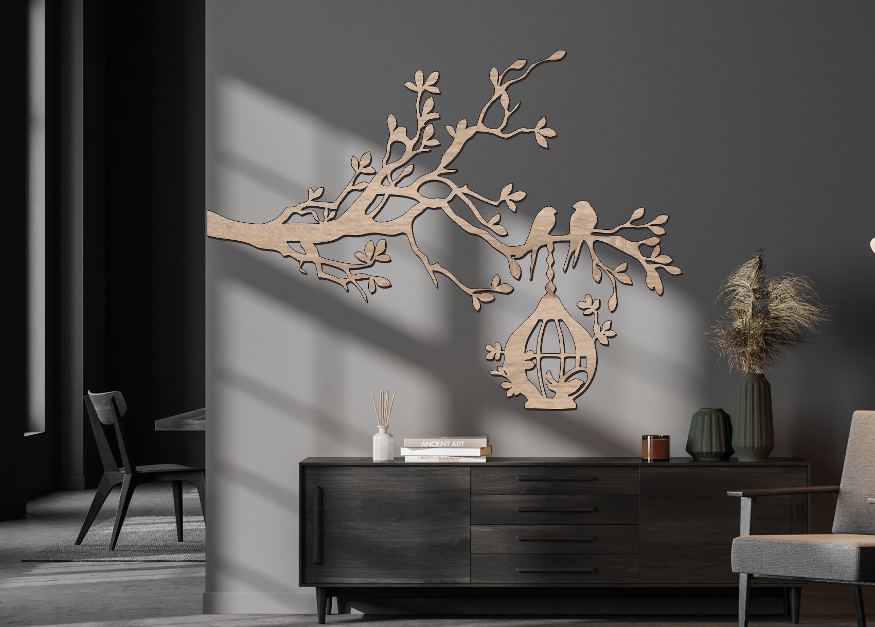 Drevený obraz vtákov na konári – moderná prírodná dekorácia