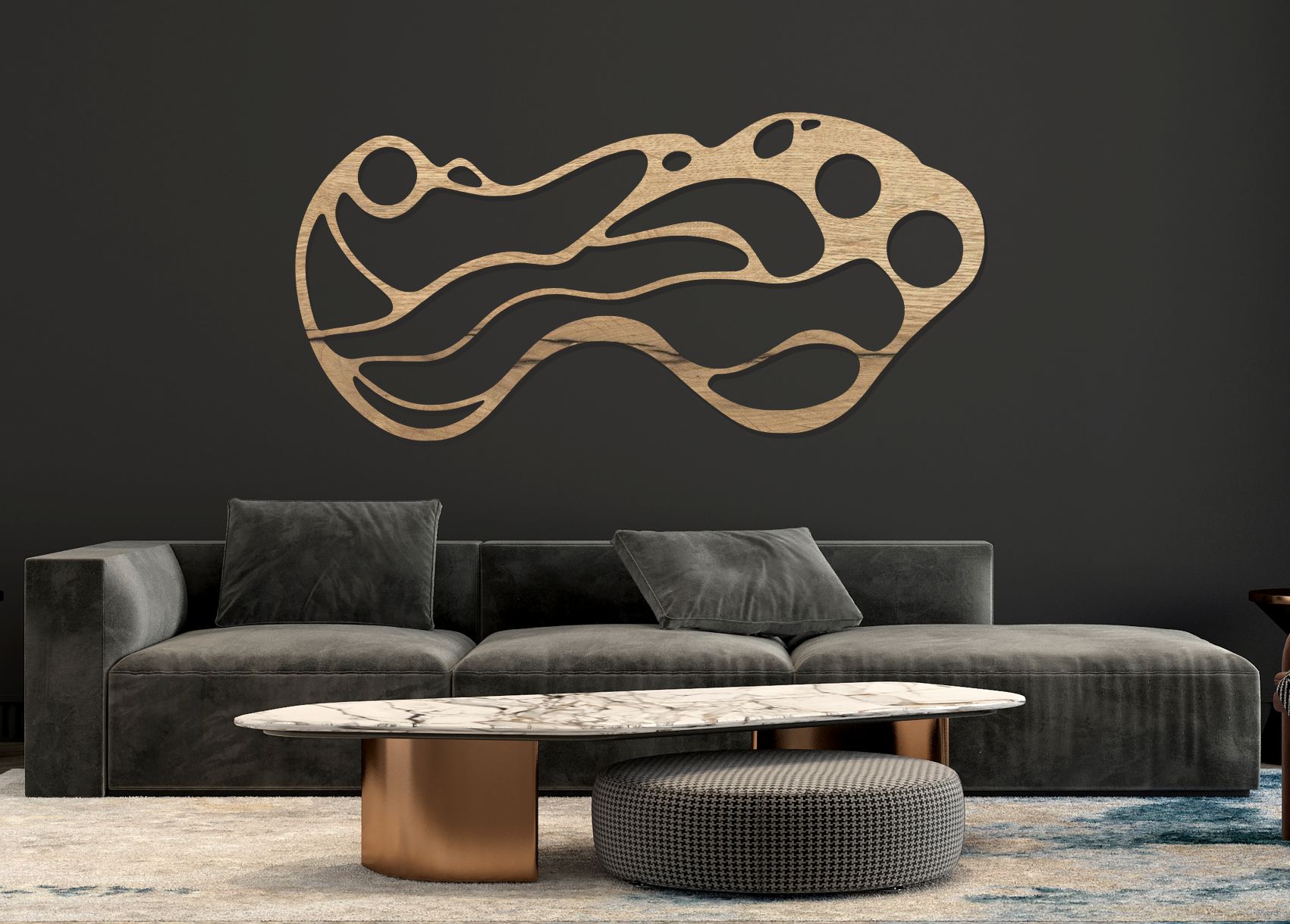 Drevený obraz na stenu – moderná abstrakcia organických tvarov je výrazná dizajnová dekorácia, ktorá dodá priestoru moderný, elegantný a jedinečný charakter. 🌿