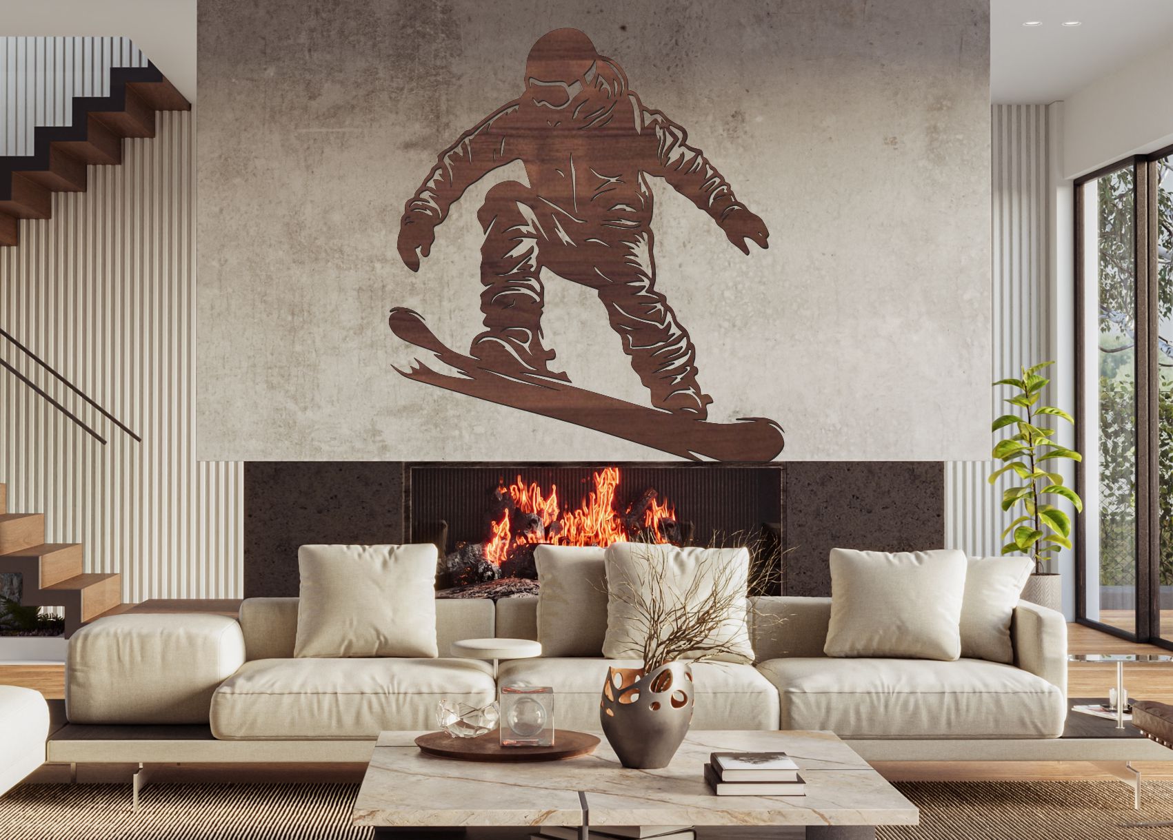 Drevený obraz skok na snowboarde – energia, pohyb a zimná vášeň v drevenej podobe