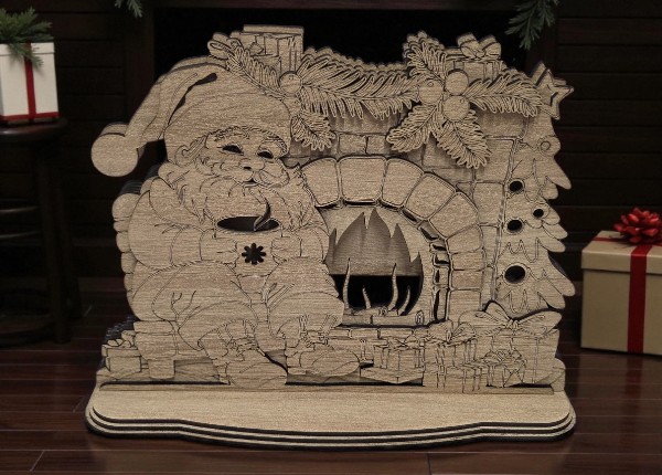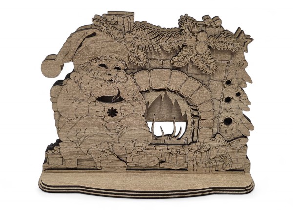 Každý detail je precízne vyrezaný laserom – od kameňov na krbe až po ozdoby na čiapke. Dekorácia stojí na stabilnom podstavci, vďaka čomu ju môžeš jednoducho umiestniť na poličku, komodu, krbovú rímsu či zimný stolík.