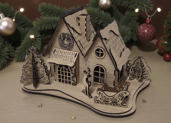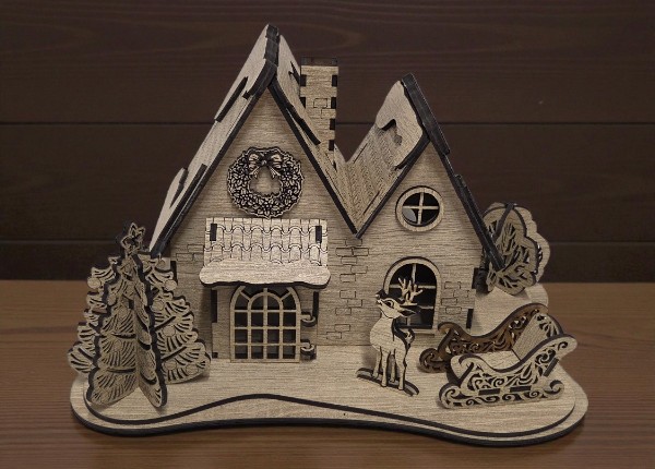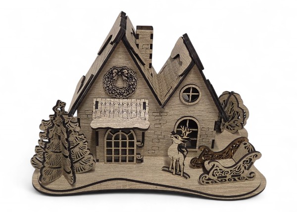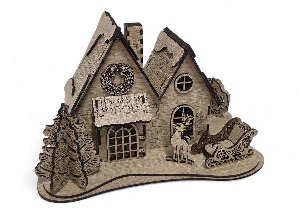 Tento pôvabný drevený vianočný domček vytvára krásnu zimnú scénu plnú detailov a sviatočnej atmosféry. Domček má reliéfne vyrezané steny, zimnú strechu, veľké okno a ozdobný vianočný veniec nad vstupom. Pred domčekom stojí elegantný jeleň a bohato zdobené sane, ktoré celému výjavu dodávajú autentický vianočný charakter.