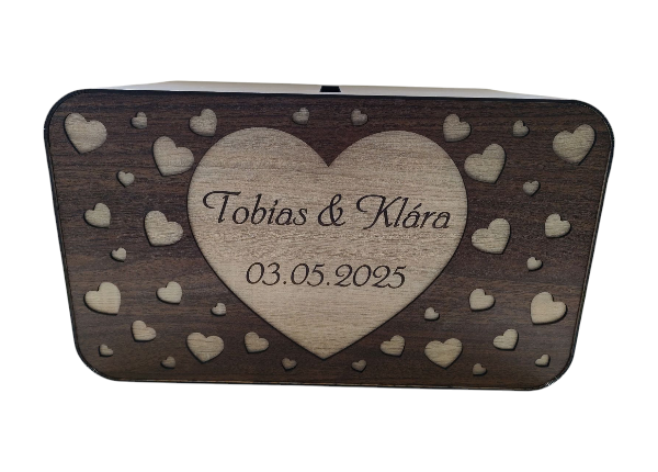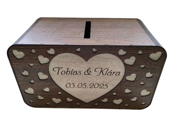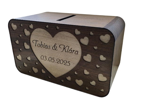 Táto drevená truhlica je jedinečnou a praktickou súčasťou každej svadby. Slúži na vyzbieranie peňazí od hostí a zároveň sa stáva krásnym darčekom na svadbu, ktorý si novomanželia môžu uchovať ako spomienku na svoj veľký deň. Vyrobená z kvalitného dreva, ponúka možnosť personalizácie – môžete si vybrať vlastný text, mená či dátum svadby.