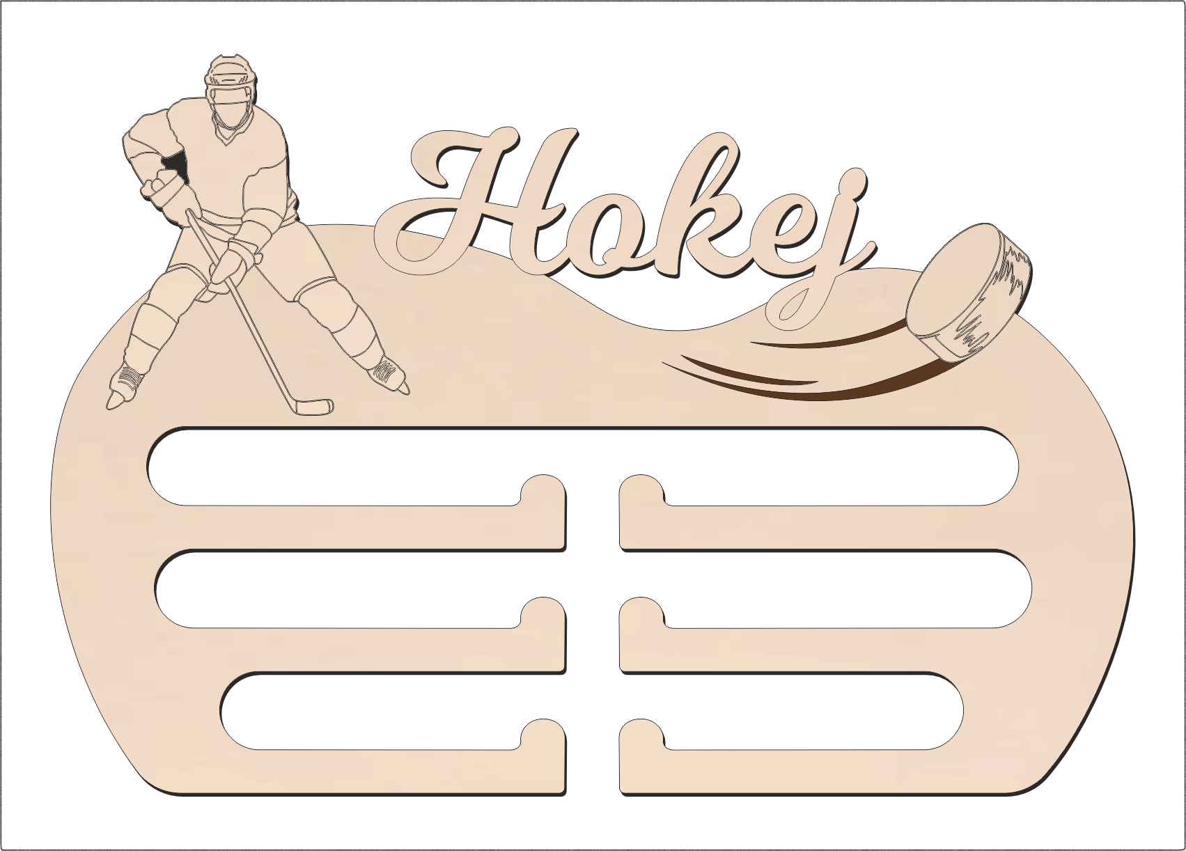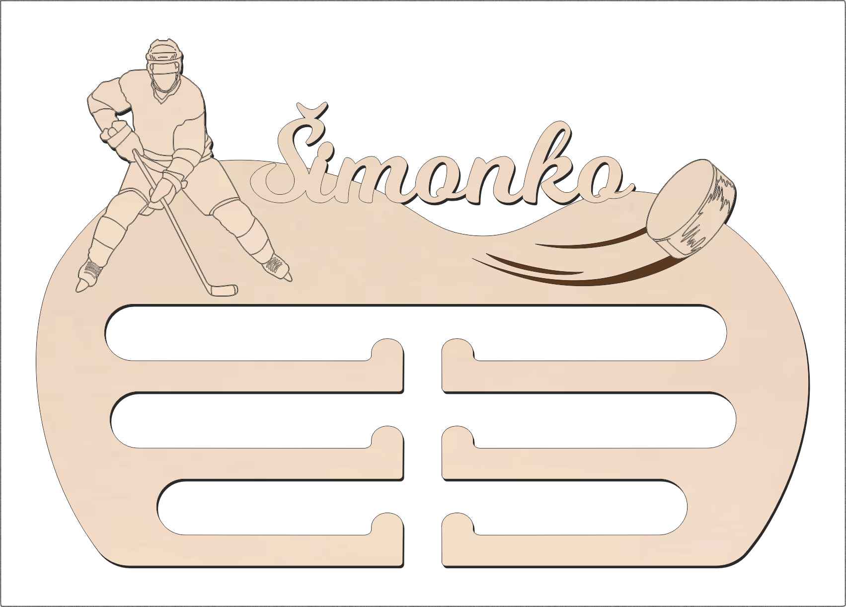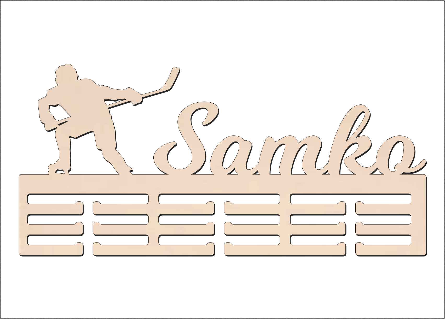 Vyrobený z kvalitného materiálu, tento vešiak na medaile je odolný a elegantný. Jeho moderný dizajn s hokejovým motívom dokonale zapadne do každého interiéru – či už do izby mladého športovca alebo do klubovej šatne.