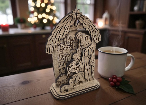 Dekorácia zachytáva jeden z najkrajších momentov vianočného príbehu – Máriu a Jozefa nežne skláňajúcich sa nad malým Ježiškom. Každá postava je precízne vyrezaná tak, aby pôsobila prirodzene, pokojne a láskavo. Jemné línie, starostlivo vytvarované tvary a cit pre detail robia z tejto dekorácie skutočné umelecké dielko.